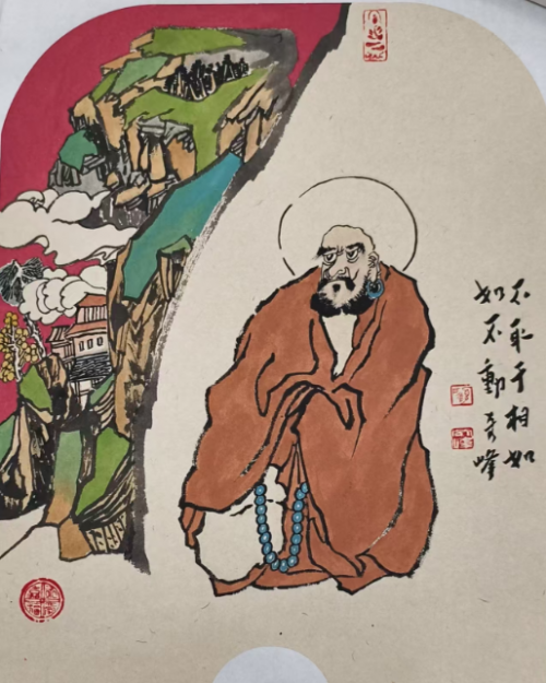 顾奇峰,又名其风,号静悟轩主,现为清华大学美术学院客座教授、禅文化学者。师从陈辛一、宫滨汀等名家,从事书画创作四十余年,形成了古朴大气、线条凝练、气韵生动的个人风格。其创作的“红衣罗汉”系列以朱砂红为主调,既承袭喇嘛袈裟的文化象征,又以简练笔墨勾勒罗汉慈祥深邃的神态,在传统禅画基础上注入温润真率的当代生命力。