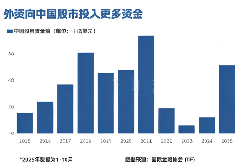 国际金融协会(IIF)数据显示,今年1-10月,外资对中国股票的投资力度升至四年来最高,前十个月流入资金合计超500亿美元,较2024年全年(114亿美元)增长超3倍。联想集团等中国科技股近期接连获得外资机构上调目标价甚至直接增配。