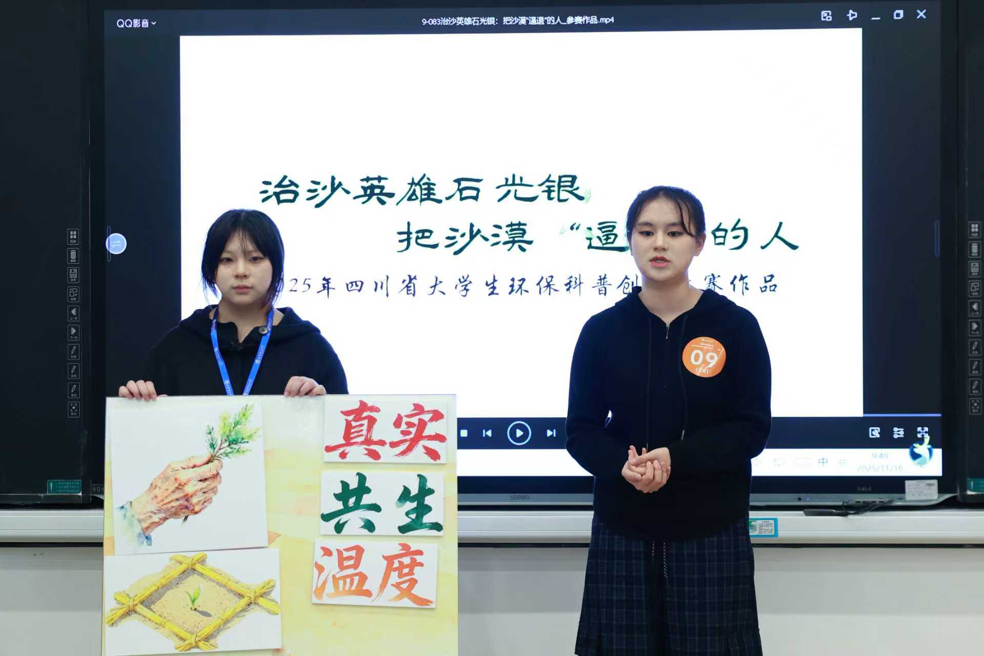 信息技术学院参赛团队聚焦治沙英雄石光银的感人事迹,以生动的科普形式展现治沙攻坚的艰辛历程与生态成果。在现场展示中,团队严格遵循大赛规则,充分传递了作品的环保理念与人文温度,其专业表现与深刻内涵赢得评委一致认可。