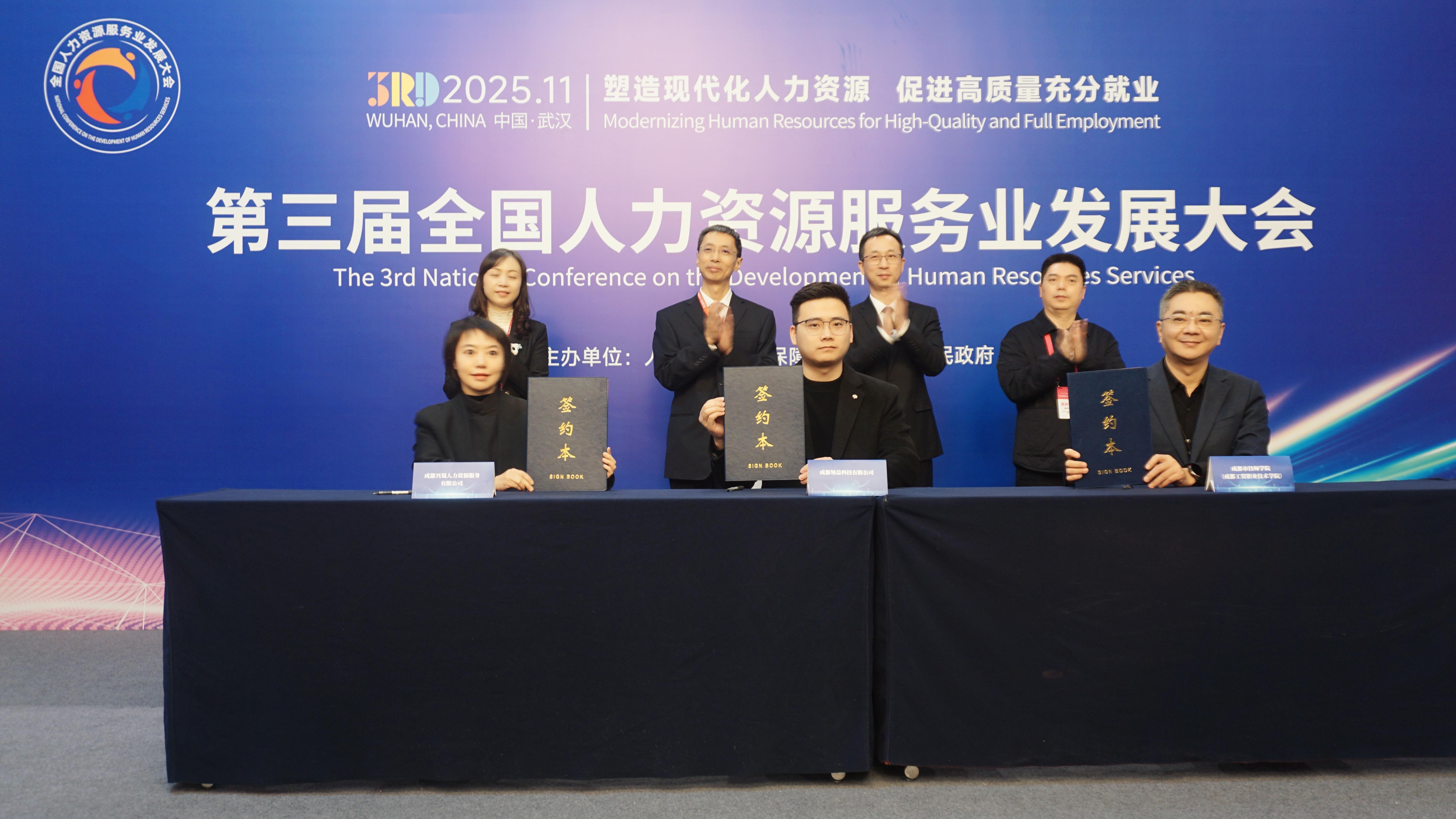 11月28日,第三届全国人力资源服务业发展大会在武汉启幕之际,成都领益科技有限公司(简称“领益科技”)、成都工贸职业技术学院(简称“工贸学院”)与成都兴蜀人力资源服务有限公司(简称“兴蜀人力”)正式签约,共建“自动化设备技术员培训中心”。这一以“产教评融合”为核心的合作精准契合成都先进制造业与现代服务业(简称“两业”)融合发展战略,创新构建协同育人体系,为破解技能人才供需错配、赋能区域产业高质量发展写下关键一笔。