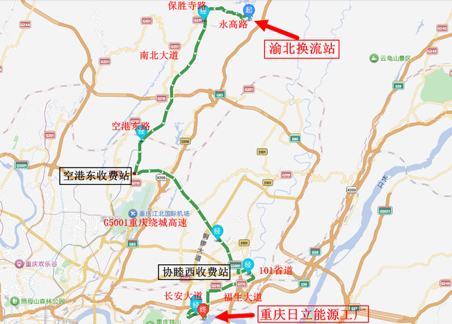 渝北±800千伏换流站项目现场出发——永高路——保胜寺路——南北大道——空港东路——空港东收费站——G5001重庆绕城高速——协睦西收费站——现代大道——渝江大道——福生大道——长安大道——和煦路——渝冠大道——福港大道——港荣路——重庆日立能源工厂。