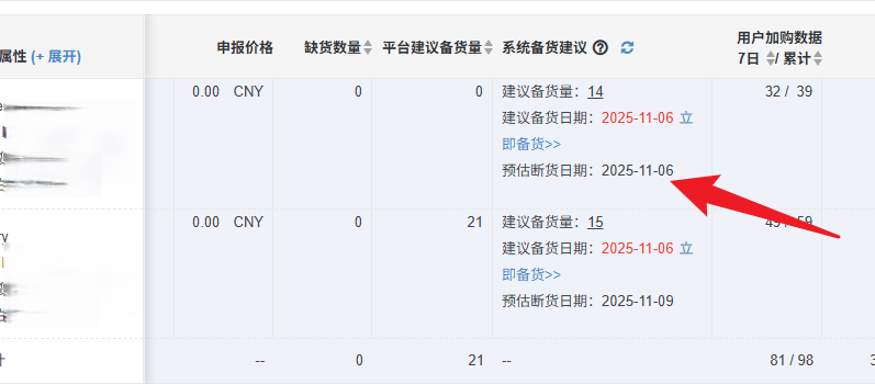 若卖家选择“按备货天数计算”模式备货,设置备货天数7天、安全库存天数3天,同时录入采购时效2天、到平台仓时效2天、入库处理时间1天,系统会自动整合全链路时效数据,提前8天触发备货提醒,精准推送7天备货量建议,确保备货节奏与销售需求无缝衔接。