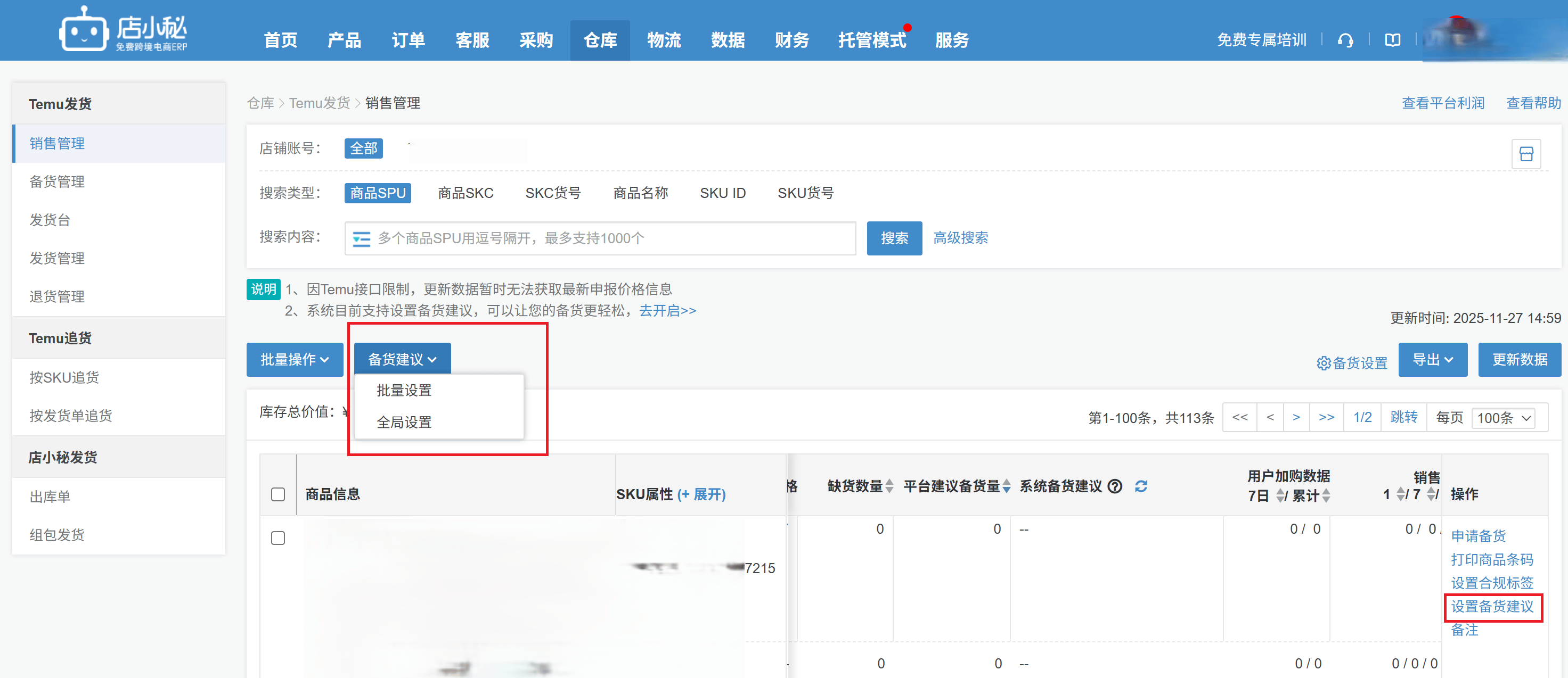 卖家根据经营需求选择全局、批量或单个商品设置「TEMU全托管备货建议」;