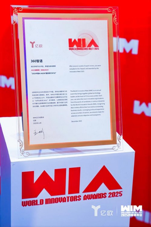 日前,由亿欧主办的“WIM2025 创新者年会”在北京举行,大会发布“2025 创新奖”系列奖项,360智语凭借在Agent+业务协同领域的技术突破与行业化实践,荣登“2025 中国 AI Agent 服务商 TOP20”,全面领跑企业级智能体行业创新赛道。