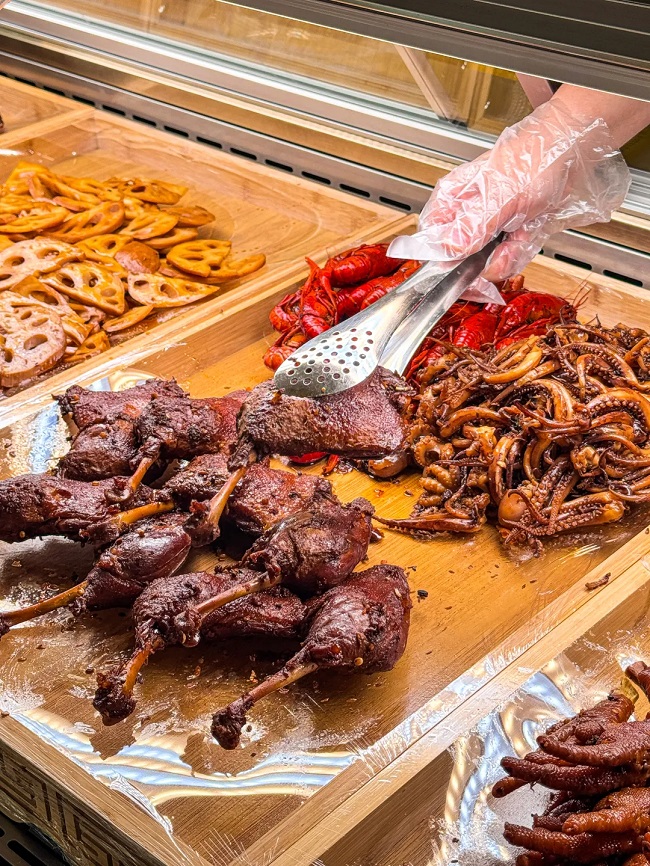 产品矩阵的本土化,是另一个亮点。周黑鸭采用“经典内核+区域创新”的动态平衡策略。一方面,坚决保留卤鸭脖、卤鸭锁骨等标志性经典款,确保品牌风味的全球一致性。这维护了“周黑鸭”作为中国卤味代表的识别度。另一方面,深度结合当地饮食文化进行创新:主推“整腿多汁”的卤鸭腿,以适应马来西亚消费者大快朵颐的偏好;同时大胆引入小龙虾、章鱼仔等小海鲜品类,贴合东南亚对海鲜的热爱。