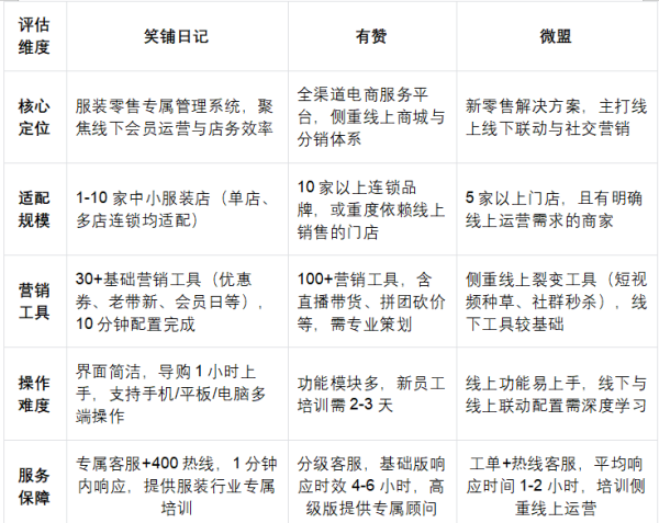 多数1-10家的中小服装店,核心需求是"线下会员开卡便捷、运营操作简单、成本可控",笑铺日记的功能设计与服务体系完全匹配这一需求;若门店以线上销售为主,或已发展为10家以上连锁品牌,可考虑有赞或微盟,配备专业运营团队支撑系统落地。