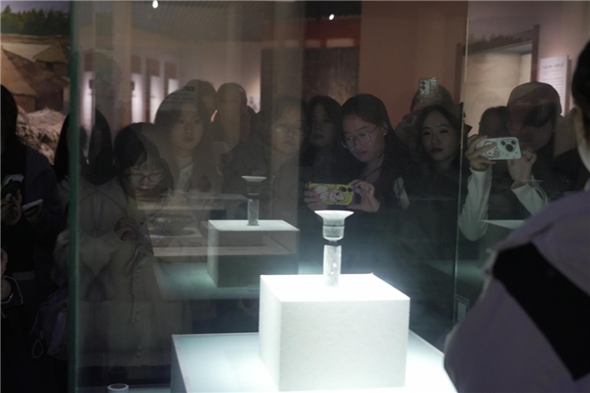 这些原本只存在于课本中的“美学符号”:龙山文化蛋壳陶镂空高柄杯、西晋青瓷胡人骑狮器、西汉金缕玉衣、汉画像石......此刻通过实物变成了可观察、可触摸、可讨论的“活课堂”,学生们不再是“听”美学,而是“看”美学、“感”美学、“悟”美学,美育课堂的生机就这样在历史与现实的碰撞中悄然绽放。