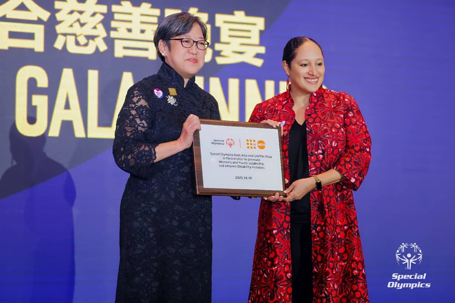 晚宴上,特奥东亚区总裁兼总经理冯美孙女士向联合国人口基金驻华代表兼蒙古国别主任那迪娅女士颁发了纪念证书,标志着双方未来将携手合作,共同赋能女性与青少年领导力,推动残障融合发展。