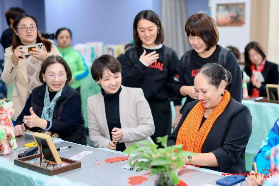12月19日下午,中国友好和平发展基金会,特奥东亚区高级顾问委员会,联合国人口基金会与合作伙伴的代表还一起参访浦东忠华职业技术学校校园。嘉宾们依次体验“元宇宙实训室”互动科技、“艺术疗愈——甜心书法创作”以及“非遗文化刺绣工作坊”,在与特奥运动员的近距离交流中,亲身感受融合教育的温度与成果。活动现场欢笑声不断,许多嘉宾在留言墙上写下祝福,并合影记录这场充满感动与启发的融合之旅。