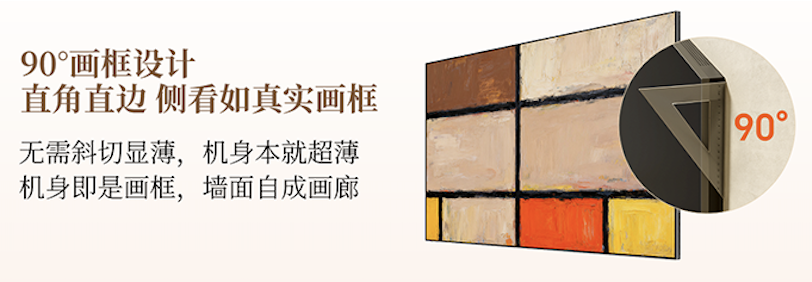 不同于传统电视,壁纸电视在设计上必须要体现出独特的科技美学,要像精美画作一样装点家庭空间,成为“艺术担当”。创维A7H从包豪斯极简主义理念中汲取灵感,首次在3.9cm的超薄机身上运用了90°直角切边设计,带来“超薄画框式机身”,正看侧看都赏心悦目。