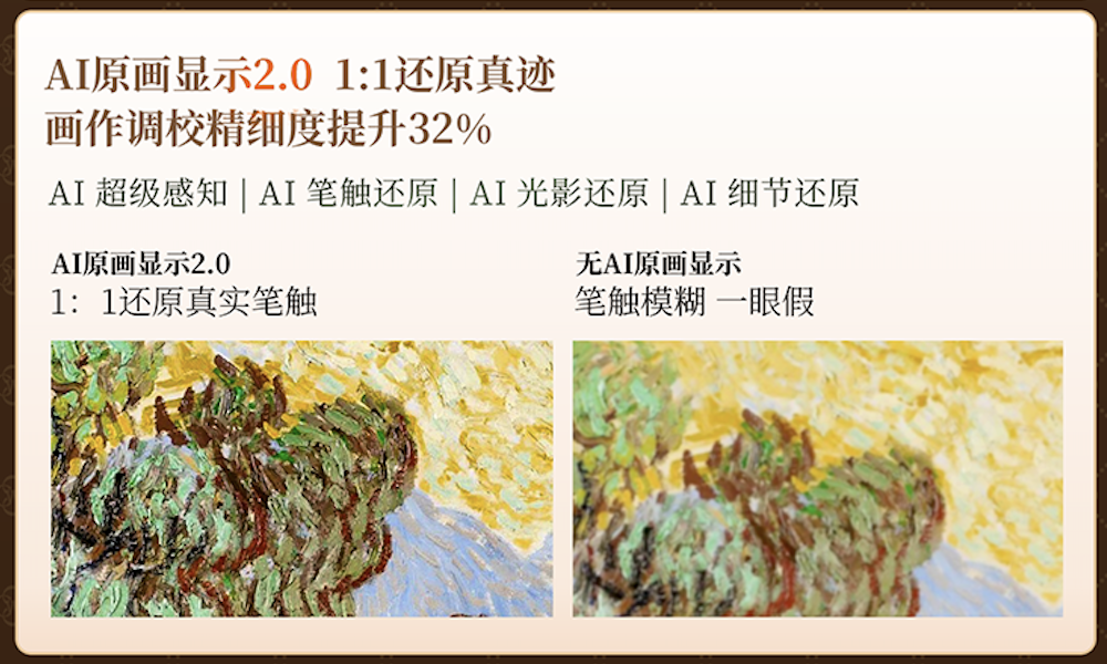 为了更加真实地还原画作质感,创维A7H搭载了全新升级的“AI原画显示2.0”技术。当显示画作时,“AI原画显示2.0”可以智能识别每个画作的风格和肌理,增强笔触、细节和光影的显示;还能根据外部环境光线的变化进一步动态调整观看效果,无论白天还是夜晚,全天候还原名画真迹,足不出户也能拥如美术馆般的视觉享受。