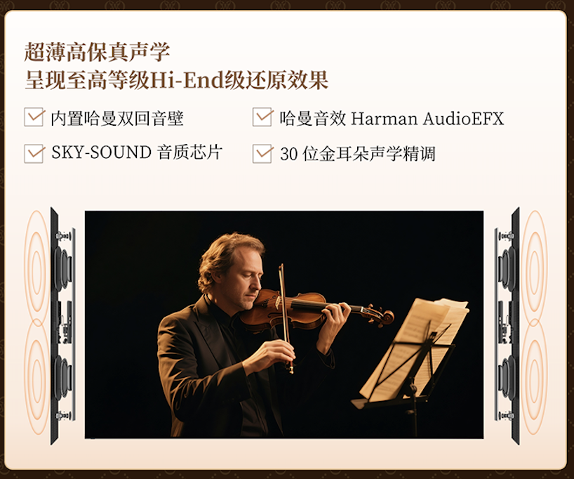 而在音质方面,创维携手30位“金耳朵”声学专家对音响系统进行了多达260项的细致调教,带来Hi-End级的超纯粹听觉享受。