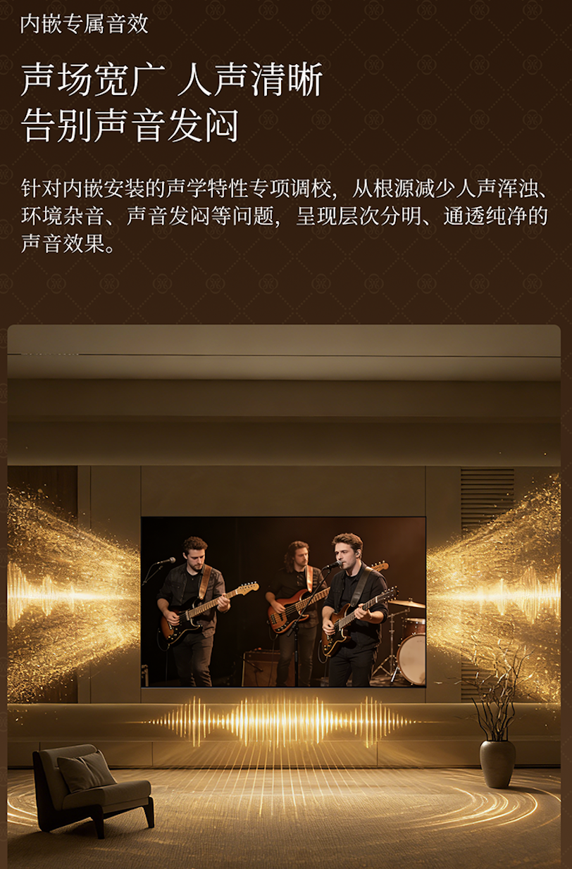 与此同时,创维A7H还针对座装、壁挂、内嵌三种安装方式的音效表现做了对应调优,尤其为内嵌式安装准备了专属音效系统,精妙的设计能从根源减少人声浑浊、环境杂音、声音发闷等问题,再结合左右两边的回音壁设计,能够大幅提升声音的解析力与环绕感。