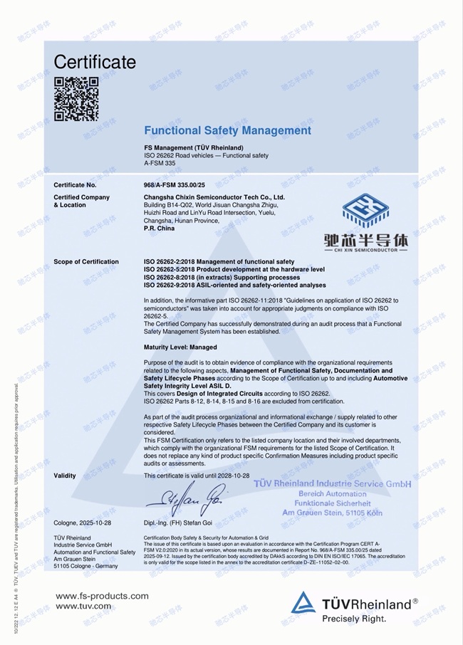 近日,长沙驰芯半导体科技有限公司(下称“驰芯半导体”)宣布获得德国莱茵TÜV集团(下称“TÜV莱茵”)颁发的ISO 26262功能安全管理体系ASIL D认证证书。这一认证标志着驰芯半导体建立的功能安全管理体系已符合汽车功能安全最高等级要求,为其进一步拓展汽车电子市场奠定关键基础。