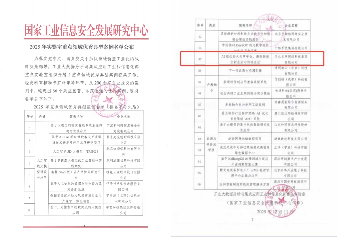 近日,国家工业信息安全发展研究中心正式公布了由工业大数据分析与集成应用工业和信息化部重点实验室组织评选的“2025年重点领域优秀典型案例”名单。天九共享网络科技集团有限公司(以下简称“天九网科”)凭借其创新案例《AI驱动的大共享平台,高效链接创新企业与传统企业》成功入选,彰显了其在人工智能与产业融合领域的突出实力。与此同时,天九网科正式获授该实验室人工智能大模型研发与应用工作组成员单位资质。此次国家权威机构的双项认可,标志着天九网科在推动数字化转型、构建产业协同生态方面的实践成果获得了权威肯定。