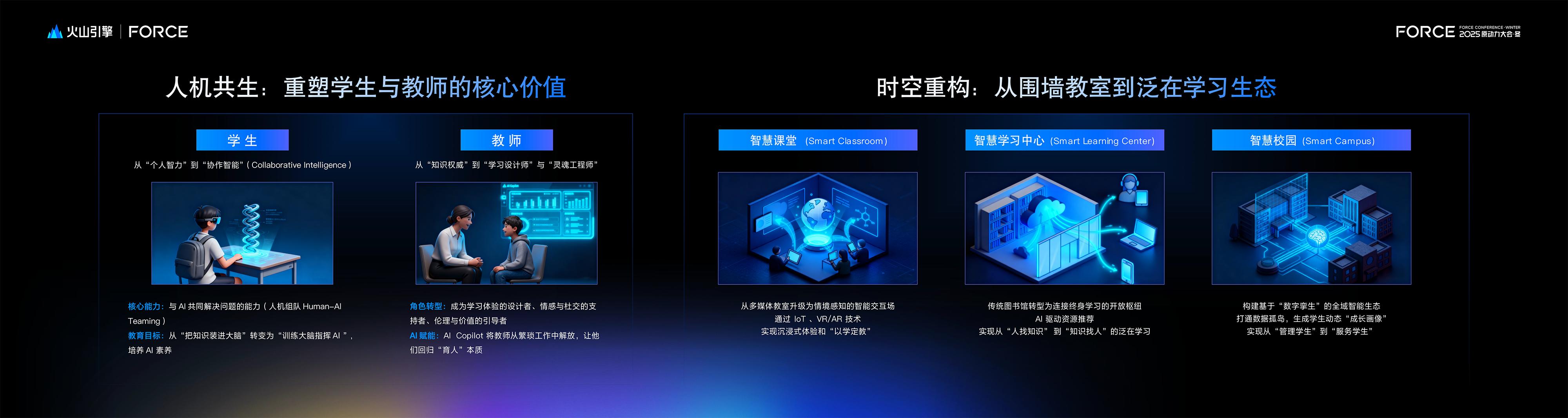 火山引擎通过底层算力、豆包大模型以及 AI 全栈工具链,与教育行业合作伙伴一起构建“未来教师、未来课堂、未来学习中心和未来学校”的未来教育全景,推动教学方式革新、学习空间拓展与学校治理智能化等领域的全方位智能升级。