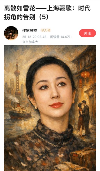 岁末之际,一部兼具文学厚度、思想锋芒与时代情感的连载散文,在华语世界持续发酵。作家贝拉发表于“华人头条”的连载作品《上海骊歌:时代拐角的告别》,数篇文章累计点击量已突破百万,引发海内外读者广泛关注与深度讨论。