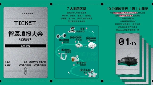 由此,潮改逐步从设计走向用车生活,形成“用户创造-品牌赋能-生态共生”的良性循环。智界的角色,也从产品提供者转变为创意支持者与生态共建者,推动汽车从标准化工业品,演进为可共创、可定制的情感伙伴。品牌先锋具象化:从线上赛事到线下场景共鸣12月25日起,智界汽车在上海潮流新地标——西岸梦中心市集广场举办为期4天的「2026智愿填报大会」,将潮改车共创大赛获奖作品汇聚线下,集结10台潮改车与七大主题体验区,打造多元化都市互动场景,与都市先锋人群共创一场人-车-场深度融合的品牌事件。