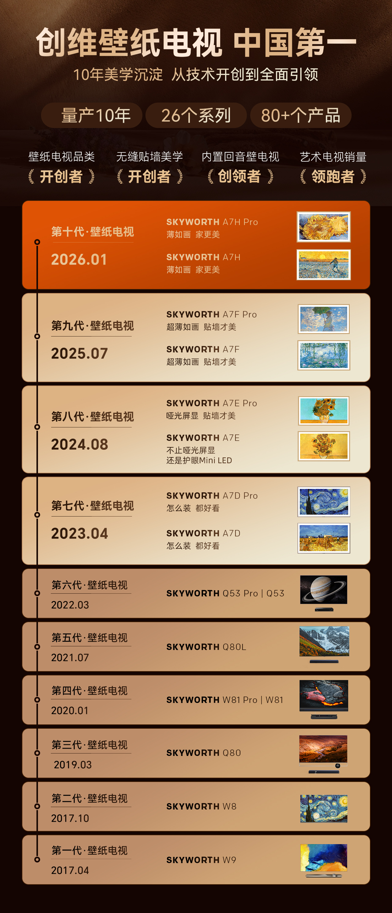 12月18日,第十代创维壁纸电视A7H系列正式推出。在过去十余年中,创维电视国家级工业中心深耕壁纸美学,已推出了26款壁纸电视系列产品,让电视逐步褪去科技的冰冷感,完成从一台电视到一幅“画作”的华丽转变。