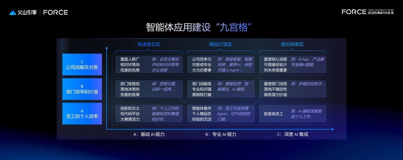 刘俊强调,市场对智能体的期待已超越单纯技术展示,聚焦于普及广度、价值高度和技术深度三大核心维度。基于对行业核心需求与技术发展趋势的洞察,火山引擎创新推出了智能体应用建设九宫格模型,为金融机构不同阶段、不同维度的智能体建设需求,提供精准的应用指引。该模型按照智能体的不同应用场景、不同发展阶段划分了梯度化落地路径。无论是 AI 应用的不同阶段(基础AI能力、专业AI能力、深度AI集成),还是企业应用的不同需求维度(个人效率提升、部门协同提效、公司战略和对客价值升级),这套模型都能精准匹配适配的 AI 落地方案,助力科学布局与高效落地。