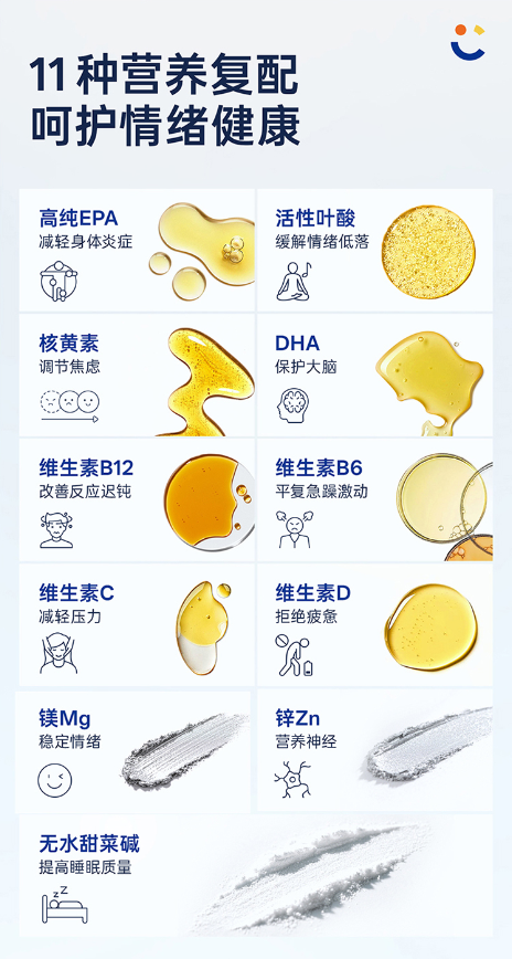 此外,cns情绪鱼油还添加了维生素D、锌、镁、B族维生素(主要是B6&B12)及维生素C等复配成分,进一步完善了营养支持体系。其中,维生素D参与神经调控与免疫平衡,锌和镁能保障神经信号传导顺畅,B族维生素可与活性叶酸协同强化神经递质合成,维生素C则可增强抗氧化能力,减少氧化应激对神经细胞的损伤。多成分共同作用,旨在系统性地支持产后宝妈的情绪健康。