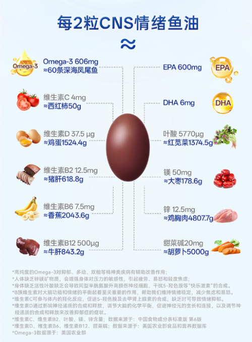 在此基础上,cns情绪鱼油还添加了维生素D、锌、镁、B族维生素(B6&B12)及维生素C等复配成分,进一步完善营养网络。维生素D可抑制压力激素过度分泌,减轻情绪低落感;锌和镁能平复神经过度兴奋,改善因紧张引发的失眠问题;B族维生素与活性叶酸协同作用,强化神经递质合成,提升抑郁调节效率;维生素C则能清除自由基,帮助身体平复应激状态。多种成分协同配合,让营养补充更精准全面,为学子的情绪健康搭建温和的防护体系。