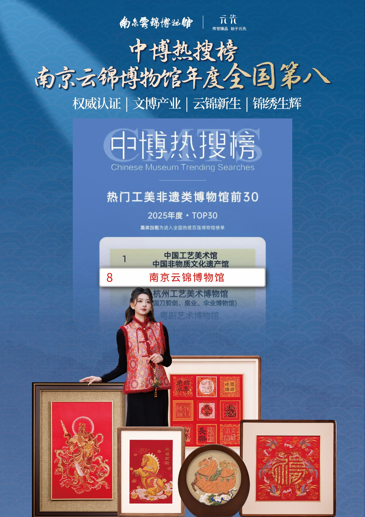 随着 “2025 年度中博热搜榜” 的发布,在 “热门工美非遗类博物馆” 榜单上,南京云锦博物馆的名字格外醒目,不仅连续三季度跻身榜单前十,更在年终评选中斩获第 8 名。云锦博物馆与中国工艺美术馆等国家级馆群同列,在全国工美非遗类博物馆中稳居第一梯队,既体现了行业权威的认可,也反映了公众对非遗云锦品牌发展的持续关注。这份亮眼成绩,恰是新年贺词中 “非遗热”“文博热” 的鲜活注脚,折射出中华优秀传统文化在当代的强劲生命力。
