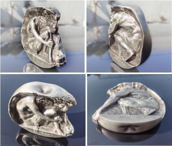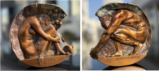 永恒挚爱叁Medal以《伊甸园》为主题,整体为苹果截面造型。伊甸园原意为“神的花园”,环境和谐美好,生活无忧无虑,是人间乐园的代称。本麦朵儿呈现的是亚当、夏娃受蛇的引诱品尝苹果后的场景:正面雕刻着低头蜷坐、含羞垂眸的夏娃,蛇探身而出匍匐于前,盯向残缺的苹果,点述了引诱的情节。背面雕刻着躬身蜷缩、俯首抱项的亚当,身体充满力量与生命的张力。通过亚当手握着的残缺苹果,将麦朵儿的正反两面融合为一体,完美诠释了爱情的真谛,具象地描述了“她是我的骨中之骨,肉中之肉”的美好爱情誓言。