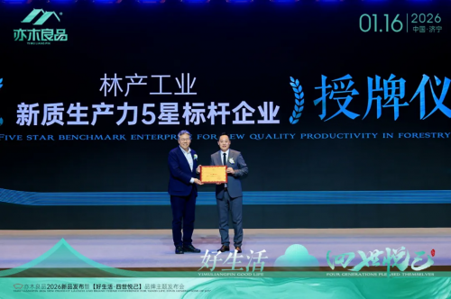在新质生产力认证环节,中国林产工业协会会长周鸿升先生为亦木良品颁发《林产工业企业新质生产力评价指南》团体标准下的5星标杆证书。作为该标准的主要起草人之一,夏海龙先生带领亦木良品在研发投入、智能工厂建设、绿色低碳生产、高附加值产品创新等多个维度表现突出,斩获行业顶尖水平的最高认可。