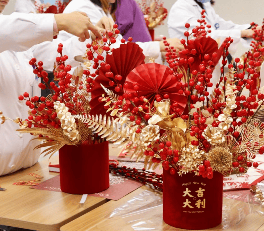 首场福桶DIY活动中,民俗手作老师以“纳福迎祥”为主题,生动讲解福桶的文化渊源与搭配技巧。红色冬青枝、金叶尤加利、小灯笼挂饰等传统花材整齐陈列,职工们在老师指导下将“福”“吉”烫金贴纸与生肖挂件巧妙组合,用麻绳缠绕出层次丰富的福桶造型。“以前过年买现成的装饰,今天亲手扎制的福桶更有年味儿,回家摆在玄关,亲戚来了肯定夸!”职工张阿姨举着作品笑道。一个个红金相映的福桶,不仅是年节装饰,更承载着对亲友“福气满盈”的真挚祝福。