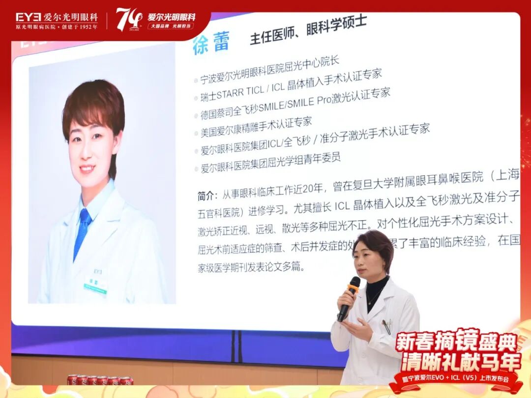 随后,宁波爱尔光明眼科医院屈光科院长徐蕾院长围绕 V5 晶体的技术特点、适应人群及临床价值进行了系统分享,结合真实案例深入解读了该技术在夜间视觉质量优化和精准屈光定制方面的临床意义。