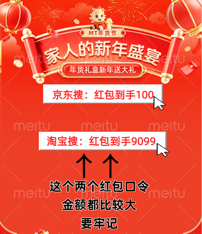 • 通用红包:搜【红包到手100】或【红包到手700】 这是贯穿整个年货节的主推口令,每天可领3次,红包金额随机,积少成多,运气好能直接抵扣几百块。