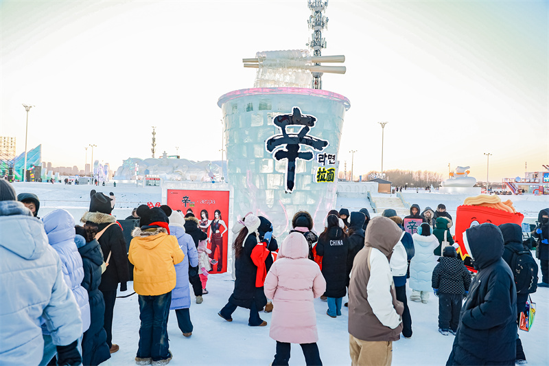 今年1月农心辛拉面走进哈尔滨冰雪大世界,以SHIN冰雕为源点,开启这场「暖SHIN之旅」。巨型辛拉面桶和aespa主题装置化身冰雕,直接“安家”于核心区域,已然成为辛拉面火热打卡新地标。游客们虽包裹着厚重的衣物,但依旧活力满满地摆出俏皮的造型与其合照,将热情能量注入冰雪大世界。