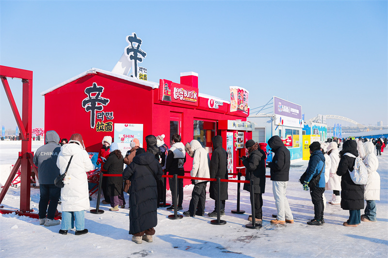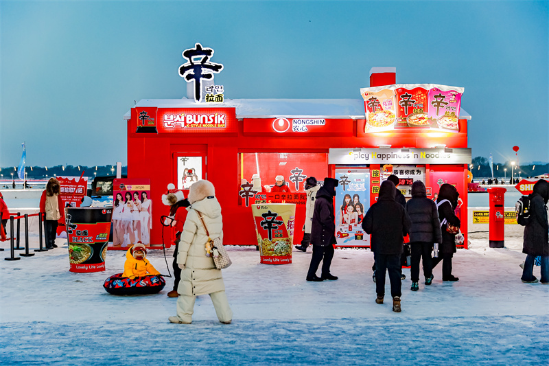 SHIN乐园在松花江冰雪嘉年华之中。红色雪屋立于冰雪皑皑的松花江江面之上,韩剧同款车站、红色秋千、冰碗游戏互动吸引游客纷纷打卡。雪屋室内更是人潮涌动,为游客呈现韩国年轻人的户外拉面文化的互动体验。