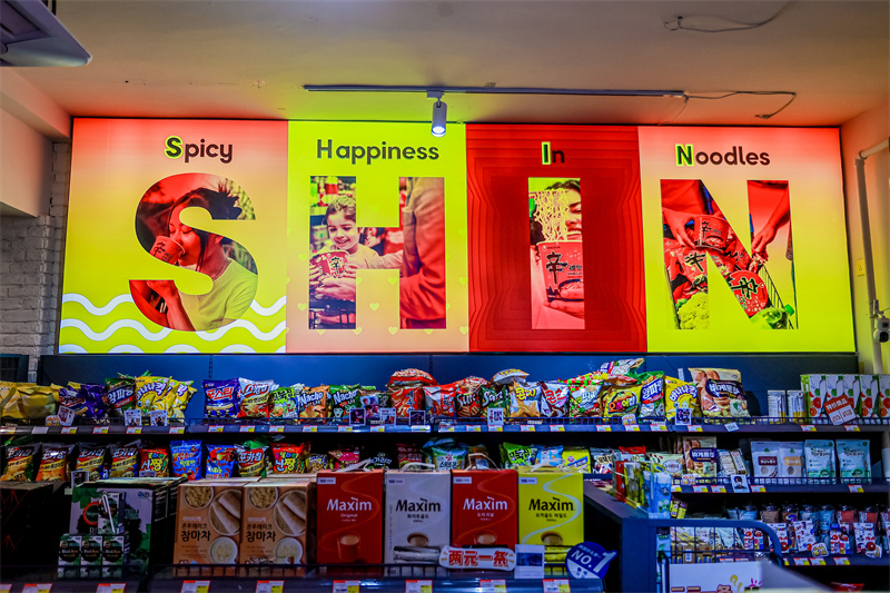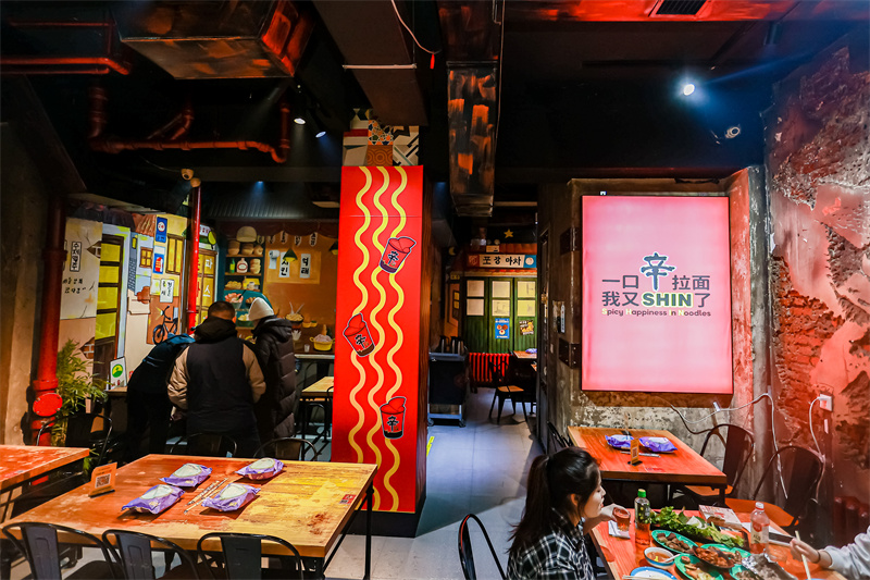 第四个站点——SHIN剧场,由农心辛拉面携手哈尔滨人气韩餐代表梁氏便利店&汤饭店共同打造。熟悉的韩式灯箱、暖色灯光、热气氤氲的辛拉面特别料理营造出温馨氛围,在这里,人人都可以成为韩剧主角。