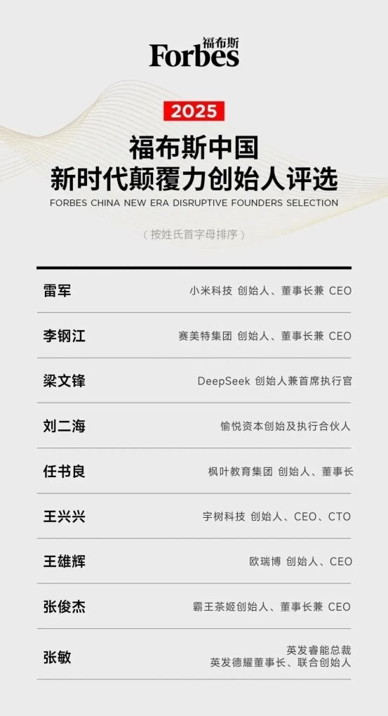 同期入选者还包括小米科技创始人雷军、DeepSeek创始人梁文锋、宇树科技创始人王兴兴等科技领军者,覆盖人工智能、大模型、智能驾驶等前沿赛道。