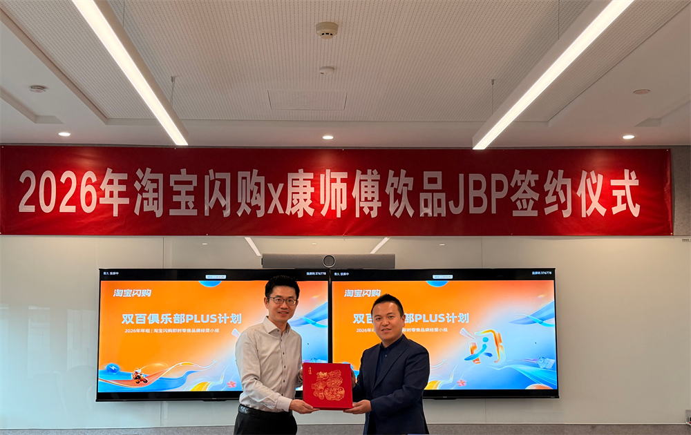 2026 年 1 月 28 日,康师傅饮品与淘宝闪购年度战略合作会议暨签约仪式圆满举行。康师傅饮品事业EC总经理余坚、淘宝闪购即时零售品牌客户负责人霖宸携双方核心团队出席,正式签约淘宝闪购【双百俱乐部 PLUS 计划】,以 “生意与用户双百增长” 为核心目标,深化全方位协同合作,共启即时零售高质量发展新篇。