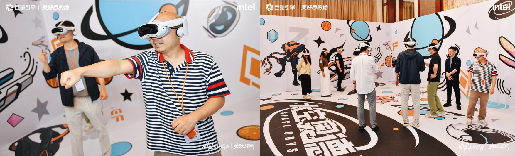 《太空奥德赛》线下大空间项目堪称全场焦点,这款由 PICO 与英特尔联合打造的科幻大作,深度融合双方在 XR 技术与芯片算力领域的多年积淀,带来颠覆性技术创新与极致沉浸体验。项目以未来星际旅行为背景,构建涵盖众多场景的宏大世界,在这场拯救世界的旅途中,玩家可解锁飞船驾驶、潜行激战、音乐光剑等多种互动玩法,与英特尔技术赋能的AI助手实时对话、并肩作战。