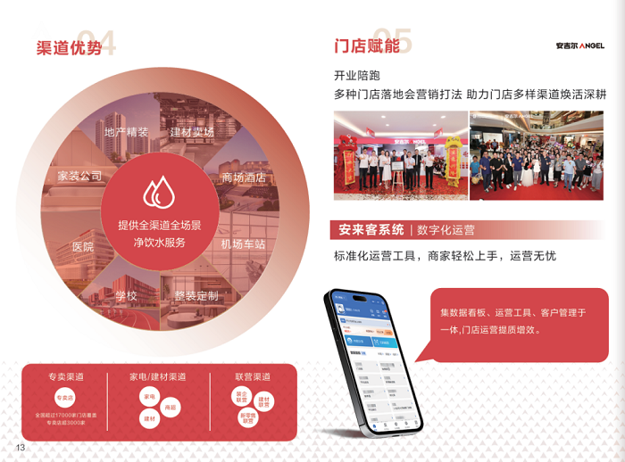多重红利袭来,把握政策与消费升级双重机遇,安吉尔投入千万级资源保障,积极寻找家用净水领域的深度战略伙伴,支持“门店+工程+电商”多渠道拓展,提供门店装修设计、终端陈列指导、导购培训(针对家用产品的销售技巧),帮助合作伙伴快速建立本地市场份额;免费安装、定期检测、终身维护的售后保障;配套数字化管理平台,一台手机搞定数据看板、运营工具、客户管理,高效统筹货盘、价盘、客户盘,助力合作伙伴高效运营。