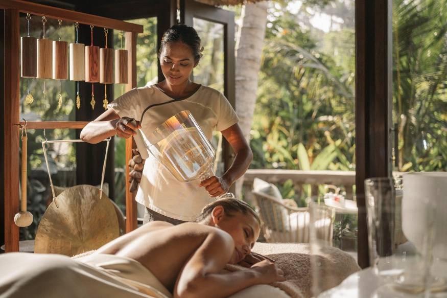 在巴厘岛金巴兰湾四季度假酒店的Healing Village水疗中心,古老智慧与先进感官疗法相融,助宾客重获澄明心境与从容自信。天光焕启仪式于启明室内举行,宾客卧于碎石英晶体之上,经由色光疗法、宝石精油、水晶按摩工具与共振颂钵的协同作用,达成身心能量的和谐统一,同时进一步提升专注力、滋养乐观心境,为需要果断决策、大胆创新和坚定行动的新一年做好充分准备。