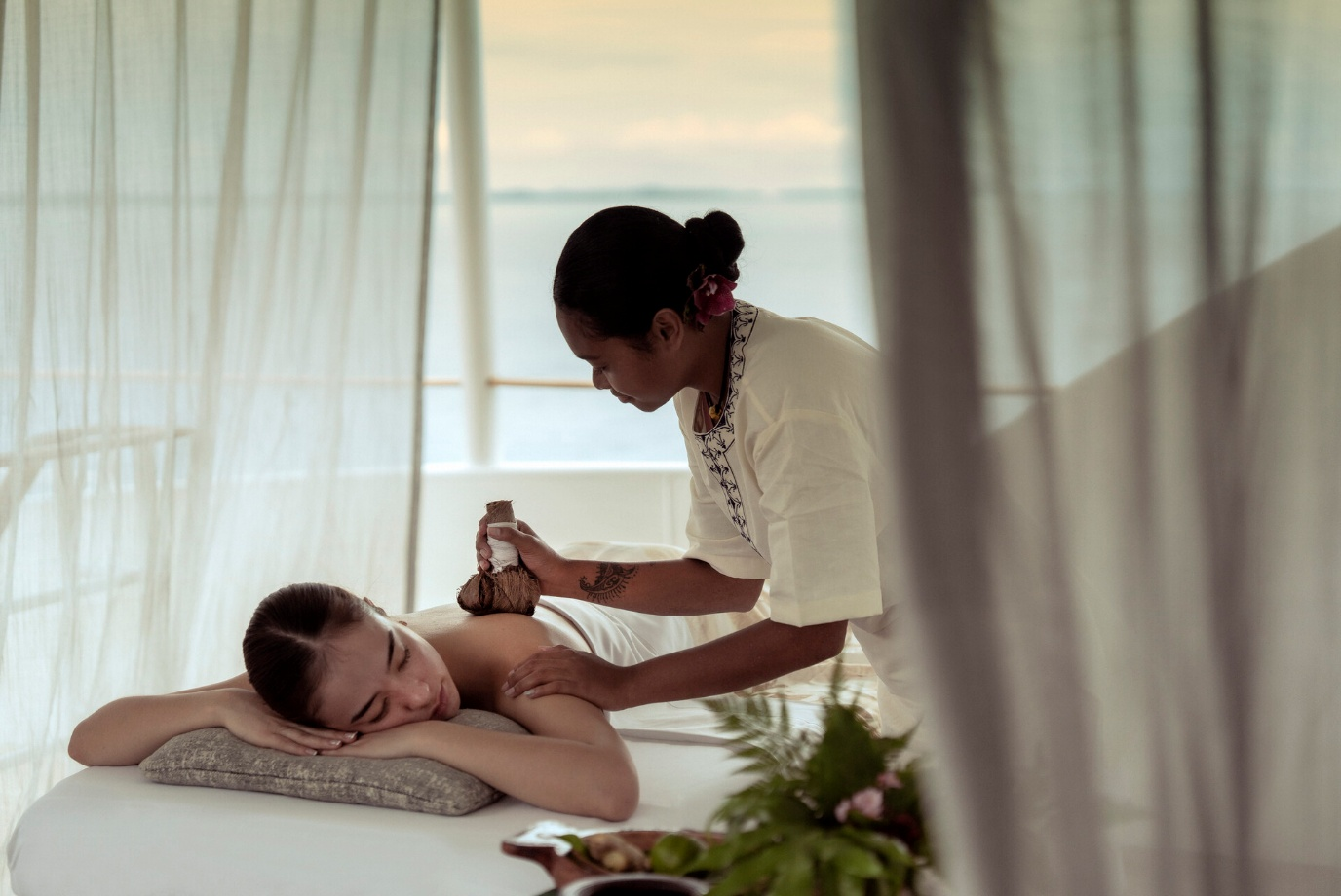 在帕劳四季探索者号豪华游艇上,Oceania水疗中心将瑜伽、调息法与融汇帕劳灵感的疗愈技艺融入航海生活,于碧波之间缔造身心平衡之境。Omengat仪式与Sasawashi静心疗愈等体验于甲板或私密海岸开启,让呼吸与地平线共鸣,使每个动作皆与当下共振。在这里,康养超越地域界限,助宾客在任何未来旅途中保持身心平衡、从容应变,并怀抱自信。