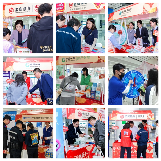 上午10时许,福田高铁站内的集中教育宣传区域已布置成一座充满年味与知识元素的“安全驿站”。中国太保产险深圳分公司、中国太保寿险深圳分公司、人保健康深圳分公司、中国人寿深圳市分公司、国寿财险深圳分公司、人保财险深圳市分公司、平安健康险深圳分公司、平安银行汽融中心、太平财险深圳分公司、太平人寿深圳分公司、阳光财险深圳市分公司、大家保险深圳分公司、同方全球总公司和深圳分公司、招商信诺总公司和深圳分公司、招商银行深圳分行、招联消费金融股份有限公司、招银理财有限责任公司、中国银行深圳市分行、中国农业银行深圳市分行、工商银行深圳市分行、交通银行深圳分行、光大银行深圳分行、广州银行深圳分行、广发银行深圳分行、兴业银行深圳分行、浦发银行深圳分行、中信银行信用卡中心等近30家机构组成的“摊位联盟”,构成了坚实的教育宣传阵地。不同于传统的单向宣讲,现场以“金融知识市集”形式呈现。各家金融机构的摊位整齐排列,不仅悬挂着醒目的警示标语、摆放着图文并茂的非法金融活动案例展板,更精心设计了诸多互动环节。