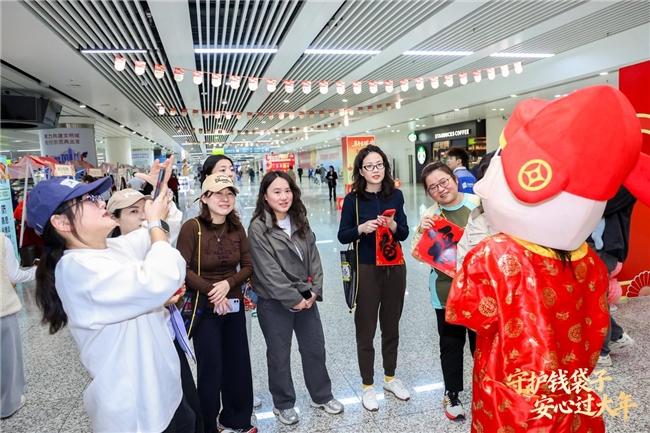高铁站内,两位身着红袍、手持“金元宝”的“财神爷”成为全场焦点。他们穿行在归乡的人流中,不仅派发象征吉祥的“福”字帖,“财神到,福气到,金融知识要记牢!”伴随着喜庆的祝福声,大量旅客被这浓厚的年节氛围吸引,纷纷驻足、拍照,并跟随“财神爷”的脚步,主动走进“金融安全市集”,让严肃的金融知识普及在欢声笑语中拉开了序幕。