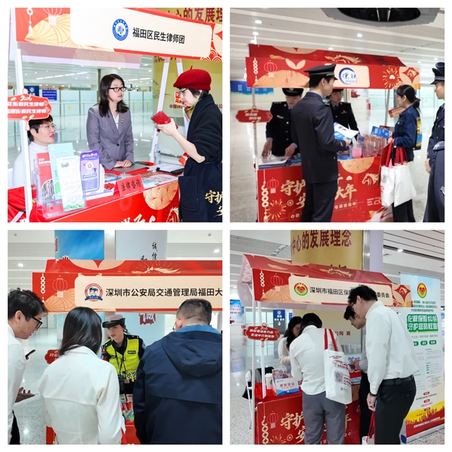 特别值得一提的是,深圳市福田区司法局、深圳市福田区保险业人民调解委员会、深圳市公安局交通管理局福田大队以及深圳铁路公安处福田站派出所的深度参与,为此次活动赋予了更深层的“安全”与“法治”内涵。活动现场,两位佩戴“民生律师团”蓝色徽章的律师格外醒目。他们坐镇法治服务摊位,针对春运期间高发的金融诈骗、出行纠纷等问题,通过“以案释法”的方式,用通俗易懂的语言详细拆解骗局套路和法律风险,讲解识别技巧、应对方法及维权途径,全方位提升群众金融安全意识和风险识别能力,成为春运旅途上一道温暖的“法治风景线”。福田区司法局以此次活动为契机,创新“流动普法+即时服务”法律服务模式,让出行群众在候车间隙便能便捷获取专业法治帮助,切实以法治力量守护民生福祉、护航群众出行,持续擦亮福田法治惠民亮丽底色。