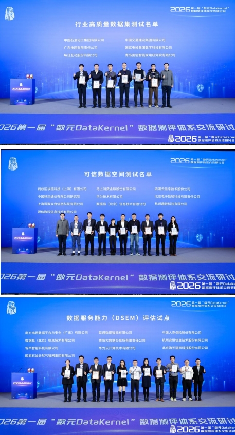 会上,中国电子技术标准化研究院联合各地方主管部门、数据集团、数交所以及科研机构 、央国企 、民企等 20 家单位代表共同成立“数元DataKernel ”数据测评实验室并启动生态合作伙伴计划,与政产学研用一起“共建基准、共研技术、共筑能力、共促创新 ”。同时 ,中国电子技术标准化研究院正式发布了“数元 DataKernel ”数据测评体系 1.0,遵循“价值基础构建、价值载体形成 、价值实现保障”三层设计逻辑 ,覆盖数据管理能力成熟度评估( DCMM )、数据服务能力成熟度评估( DSEM )、高质量数据集质量测评 、数据格式标准符合性测试、数据产品质量测评 、可信数据空间测试和大数据系统测试等。