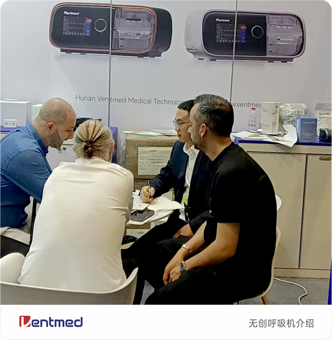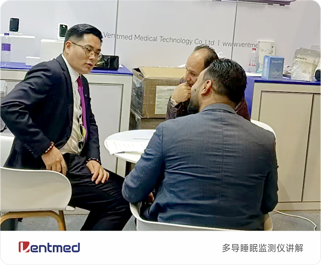 本次展台上,万脉医疗精心打造了一个集产品展示、技术体验与专业交流于一体的沉浸式空间。核心展示区,全系列睡眠呼吸机、智能监测设备及云端管理平台联袂登场,清晰诠释了从筛查、诊断到干预、管理的完整闭环解决方案。现场观众可亲身体验产品的卓越性能与舒适设计,感受科技带来的健康蜕变。简洁明快的设计风格、深入细致的技术讲解,吸引了众多国际客户驻足咨询、洽谈合作。