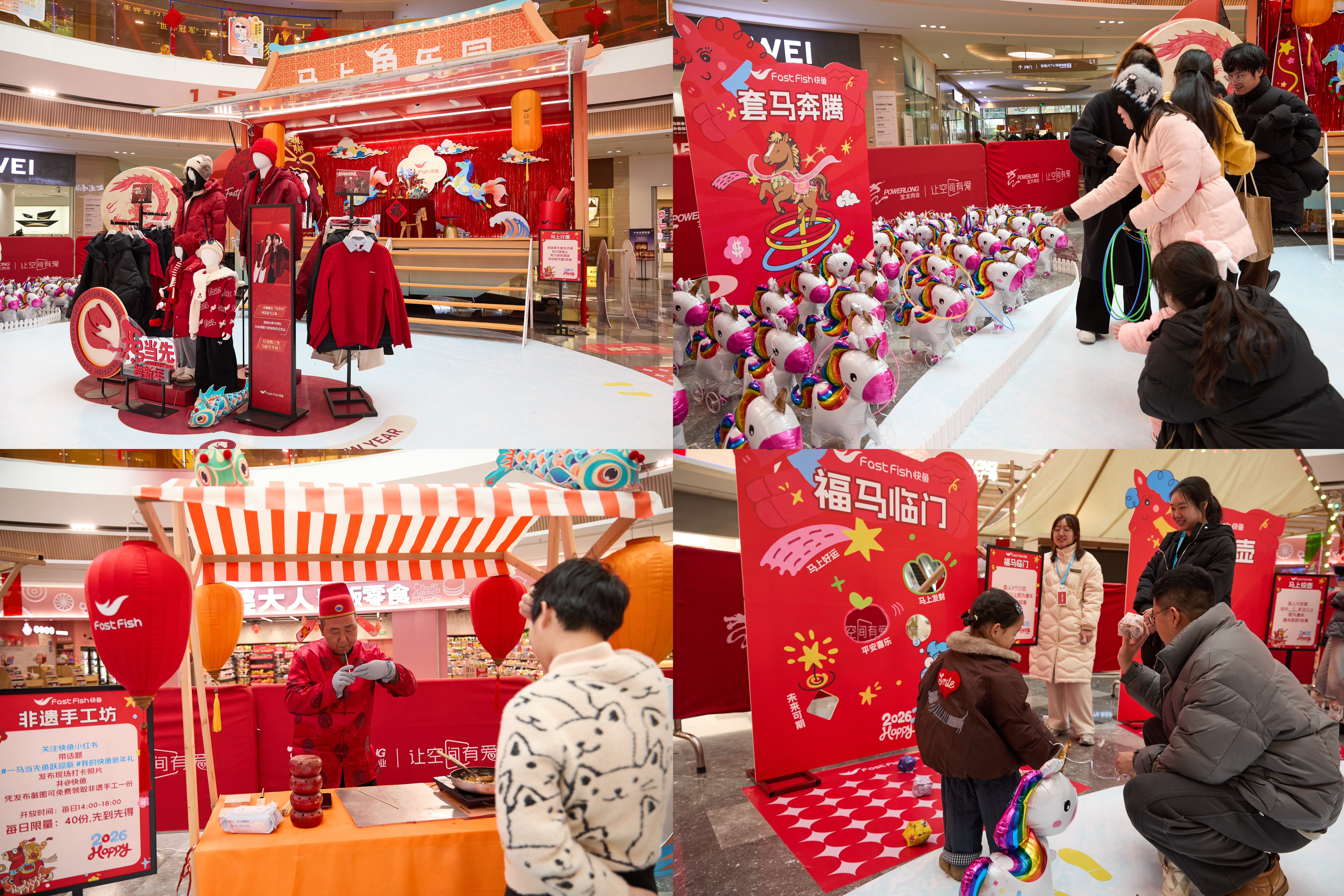在文化表达上,品牌摒弃浅层元素堆砌,2026马年之际融合“鱼”“马”吉祥意象,新春服饰融入东方纹样,“马上鱼乐园”快闪店结合锦鲤传说,实现传统文化与现代体验的双向赋能。传播层面,快鱼贴合短视频生态,打造“搞笑+温情”的轻量化内容,精准触达年轻群体,提升品牌影响力;同时搭建用户共创体系,联合博主产出内容、发起社交话题、邀请会员参与非遗体验,让用户从受众变为品牌参与者,强化长效联结。