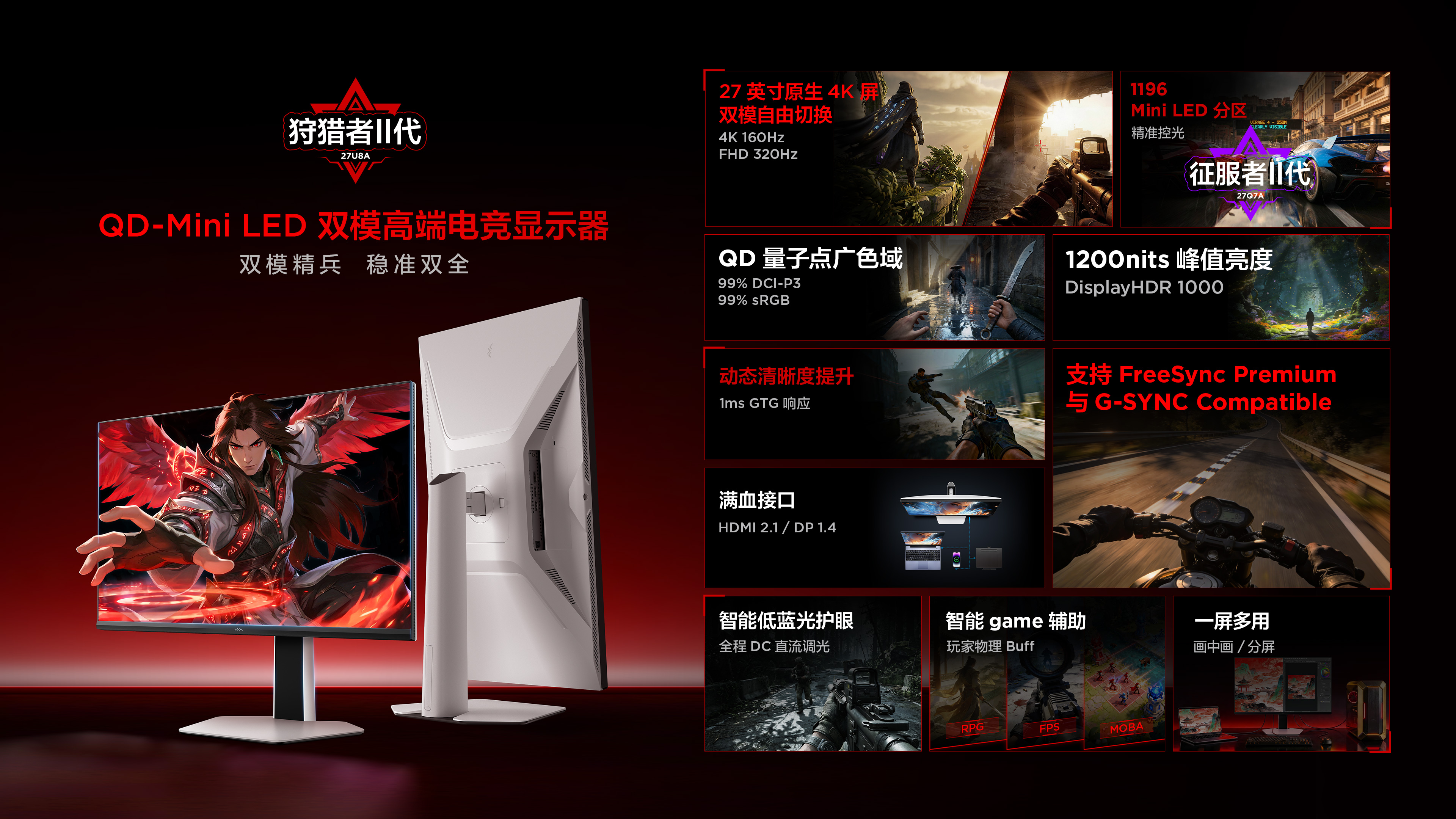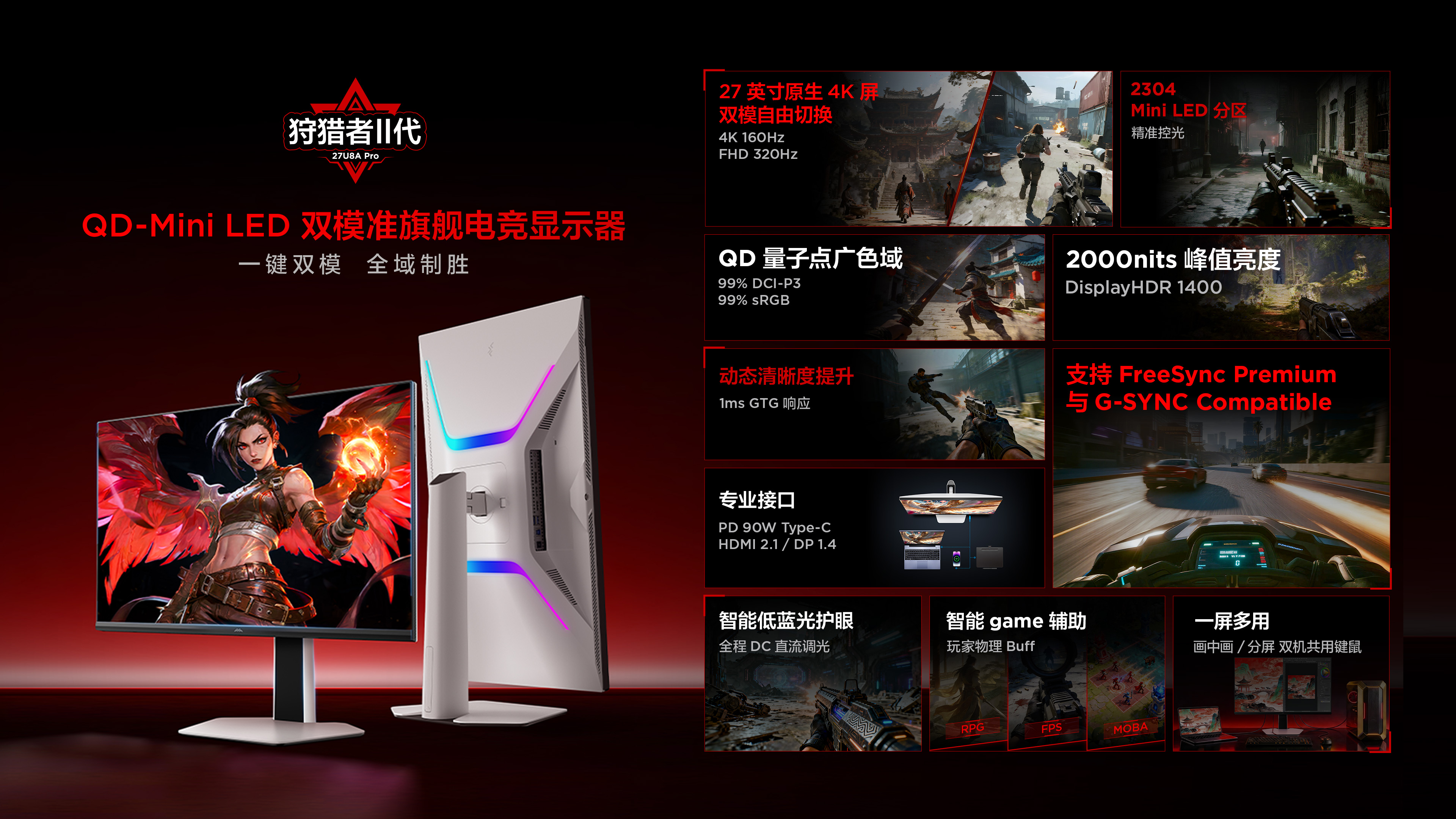 完全保留了OSD一键双模切换与MiniLED控光两大核心功能,可实现4K 160Hz画质模式与FHD 320Hz高刷模式的无缝切换,操作便捷性与核心体验和旗舰款保持一致;同时保留ΔE<2的专业色准与1ms GTG原生响应速度,确保画质表现与高刷流畅度不打折扣,能够满足多数用户的办公、游戏、创作需求。