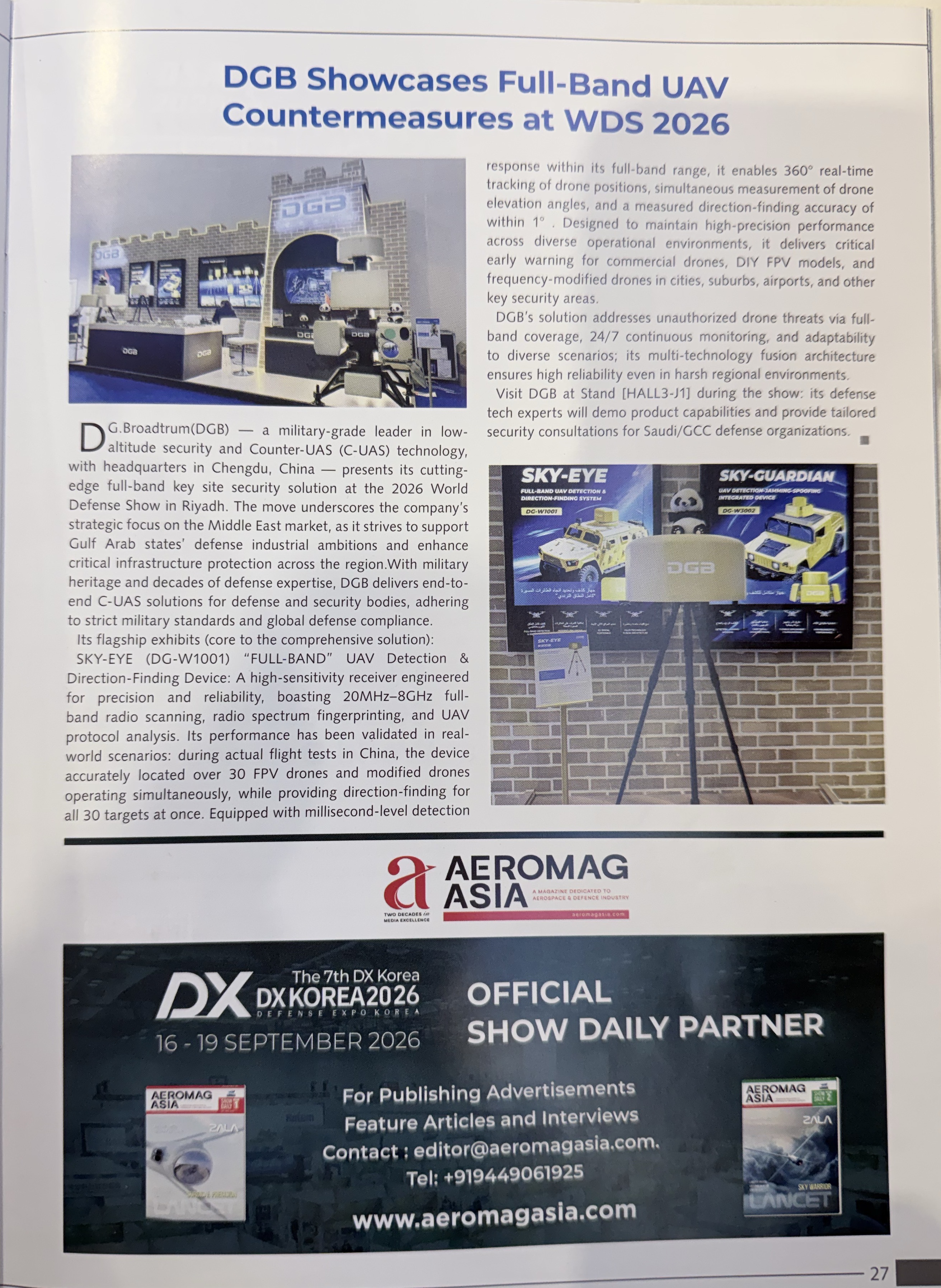 ARABIAN DEFENCE杂志、aeromagasia.com等多家国际防务领域专业媒体纷纷对DGB进行现场采访,DGB技术专家团队围绕低空空域安全防护、无人机威胁全域应对、电磁空间安全保障等行业热点问题展开深度解读,其“全频段、全时域、全地域”的技术解决方案与本土化的服务理念获得媒体广泛报道与认可,让全球市场进一步看到了中国低空安防技术的硬核实力与国际适配能力。