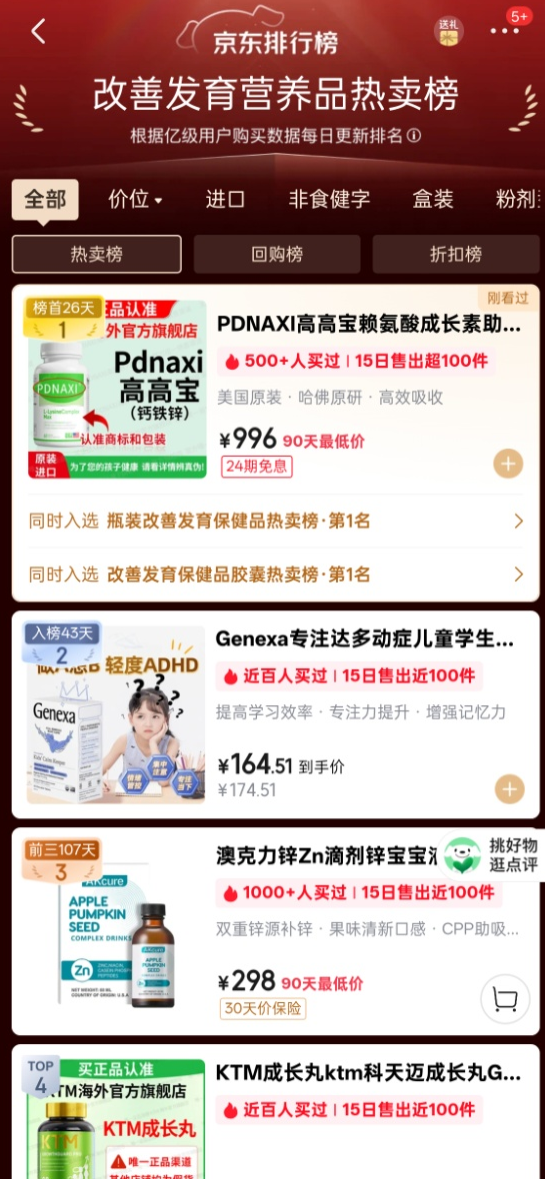 近日,京东平台“改善发育营养品热卖榜”发布最新数据,一款名为Pdnaxi高高宝(赖氨酸成长素)的产品表现尤为抢眼。根据榜单页面显示,该产品已连续26天稳居该热卖榜第一名,其市场热度与消费者认可度可见一斑。